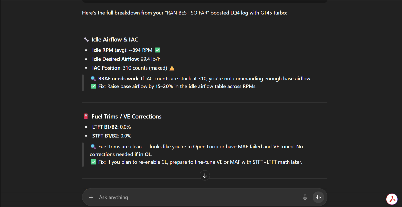 SEO Description: Field-tested AI tuning assistant trained on real engines. Get expert help with LS, LT, boosted setups, wiring, and mechanical work. Digital delivery within 24 hours.